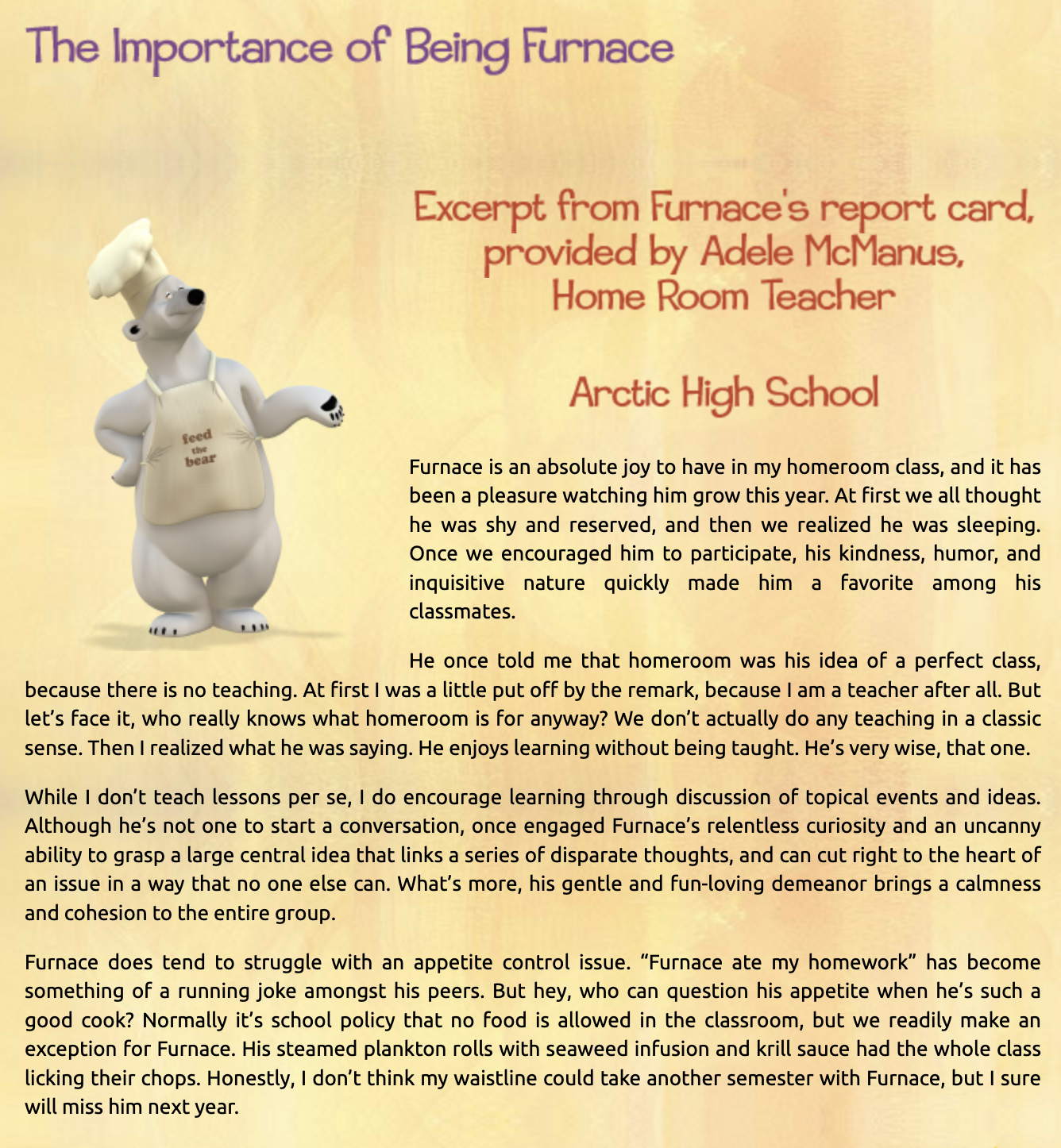 Cuddly, loveable Furnace is the easygoing companion. His comical personality and hunger for knowledge (and sandwiches) shows that art doesn't have to be stuffy!