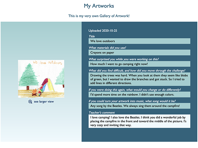 Children identify and bond with their Art Guides, facilitating the learning process. Each is different, so their personalities play off each other. Mischief, really.
