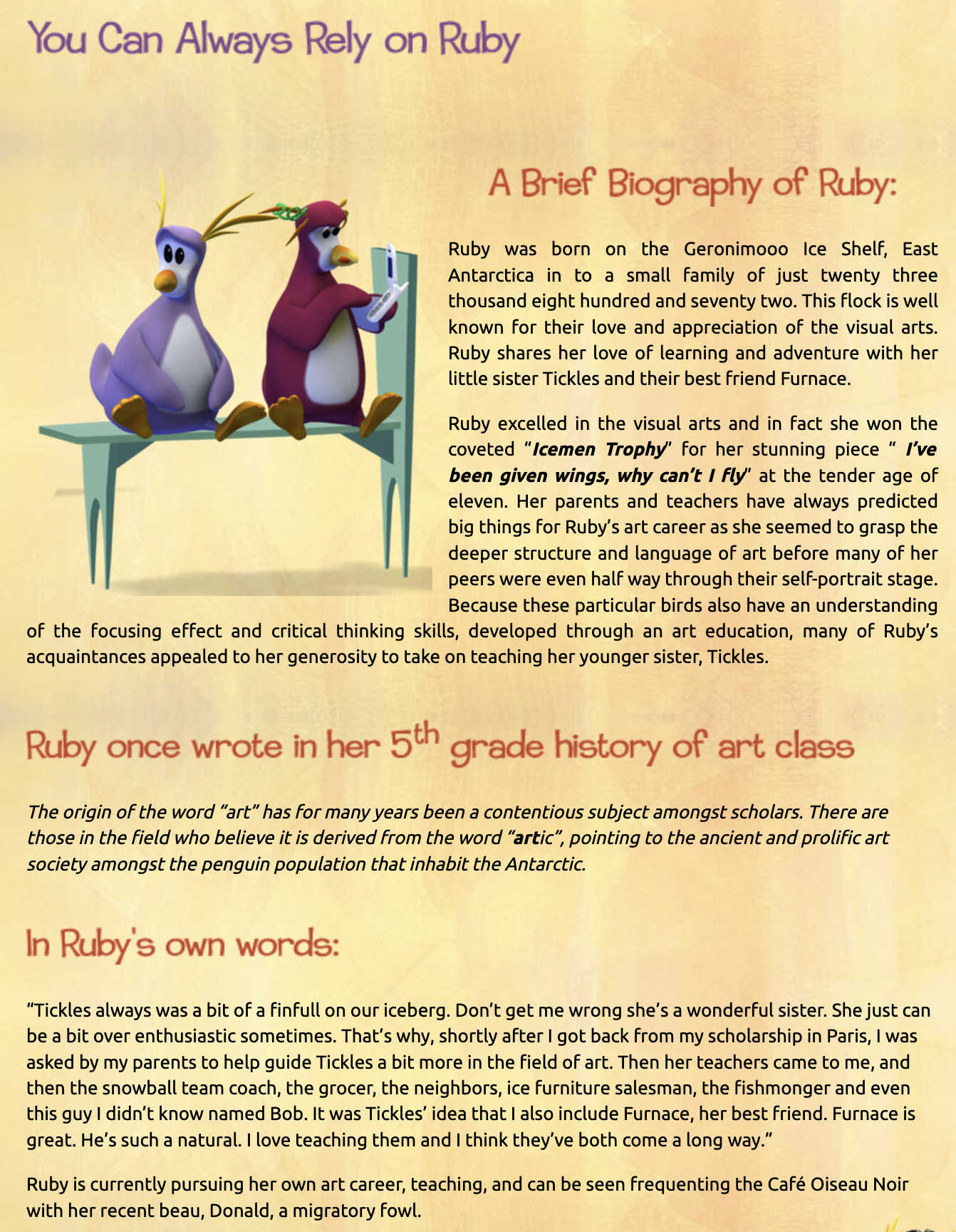 As the little sister of Ruby, Tickles is fun-loving, energetic and playful.